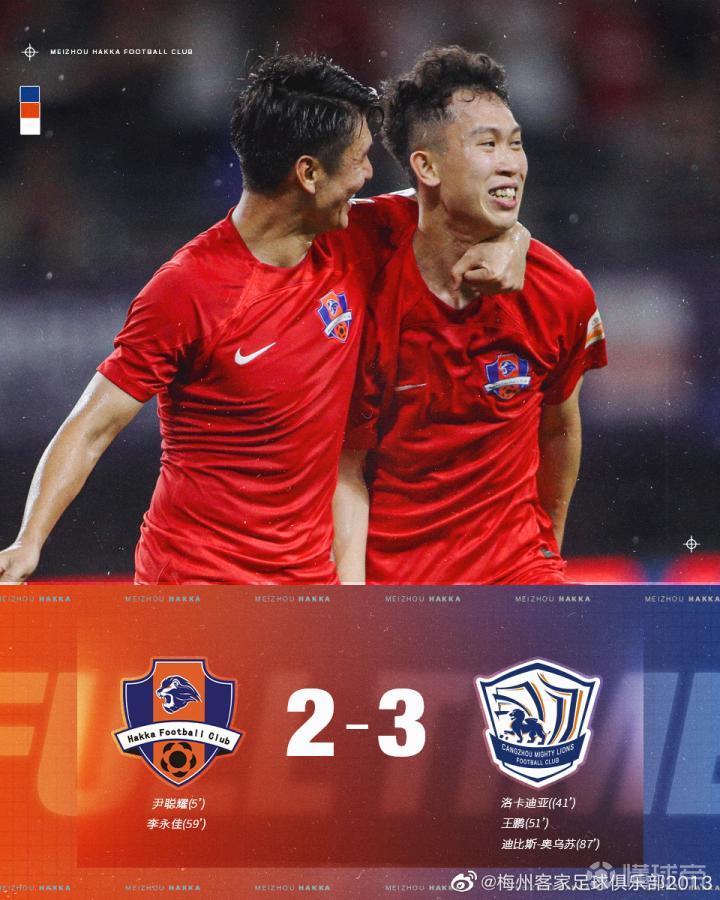 90分钟战罢,梅州客家2-3负于沧州雄狮。