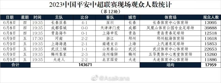北京时间6月9日,中超第12轮的比赛全部结束,观众人数方面成都39888人居首,本轮所有主场观众人数均过万,平均人数为17959人。