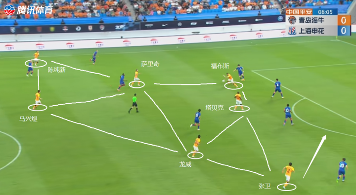 面对申花的同样的五后卫体系下,海牛这套532恐怕是整个赛季第一次真正意义上的打出了“边翼卫起飞”的效果。在海牛的进攻中,没有太多防守压力的陈纯新与张卫这两个边翼卫,经常性的前插到申花肋部,形成实质上处于边锋站位下的内切型边翼卫。而他们身后的空挡分别由许东和龙威填补,塔贝克则以福布斯为轴心左右游弋。