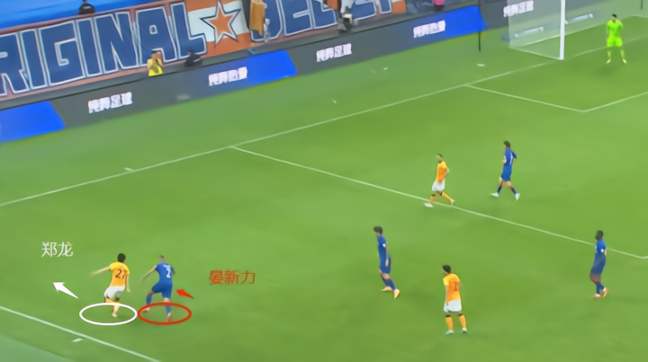 (图)77分17秒,郑龙带球尝试突破,此时晏新力还落后半个身位,且郑龙占据了先启动的优势