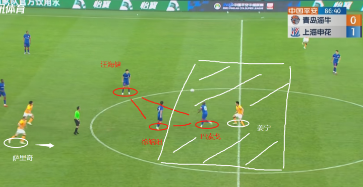 (图)80分钟之后,体能告罄的姜宁回撤,萨里奇前压负责进攻,而此时的姜宁已经无力对巴索戈—汪海健—徐皓阳三人组做出任何阻截