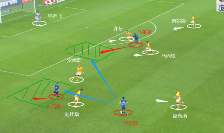 (图)申花在反击战中,于汉超从本方禁区一路带球突破,张卫与龙威均没有回追到位,而马莱莱与刘若钒能够敏锐的找到海牛防线的空档(绿色区域),于汉超无论怎么传(蓝箭)均有不错的效果
