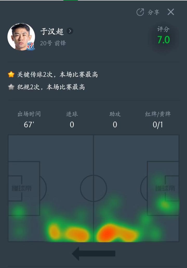 (图)本场比赛于汉超的活动热区图,不难看出其在边路能上能下,覆盖面积极大