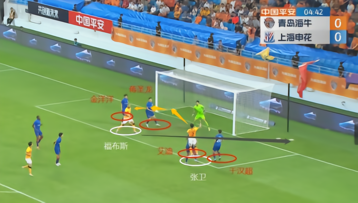 (图)张卫接萨里奇传中,在艾迪与于汉超的干扰下头球摆渡给福布斯(橙箭),福布斯在无人紧逼的情况下头球直接打偏(黑箭)