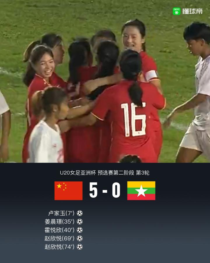 北京时间6月10日20:00,U20女足亚洲杯预选赛第二阶段第3轮展开较量,中国女足在缅甸仰光对阵缅甸女足U20。上半场霍悦欣角球送出助攻,卢家玉头球破门,之后王爱芳凌空远射中楣,姜晨璟乱中抢射破门,随后霍悦欣小角度任意球破门。下半场赵欣悦接长传后过掉防守推射破门,之后汪思倩长传造成门将冒顶,赵欣悦破门完成双响。全场结束,U20中国女足5-0战胜缅甸女足U20,与中国台北女足U20携手晋级U20女足亚洲杯正赛。