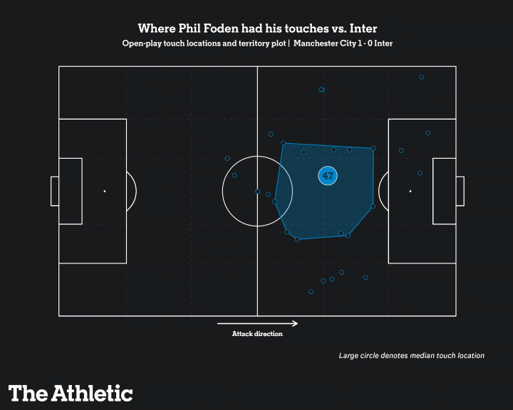 德布劳内更多在左路游走,试图扯开国米狭窄的中场宽度。而福登则在中路活动,就在哈兰德身侧,试图在国米封锁得极为紧密的禁区前沿寻找空间。