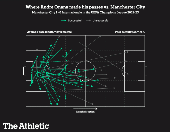 奥纳纳不只是一位门将,他拥有“诗人一般的视野,喜剧演员一般的时机把握,以及你所知道的所有伟大10号球衣必备的传球创造力”。在需要全军出击的最后15分钟,是奥纳纳一次又一次发起长传策动攻势。在90分钟里,喀麦隆门将为国米提供了第三多的传球(55次,仅少于布罗佐维奇和阿切尔比),73%传球成功率,甚至与对方中场核心德布劳内相比(78%),也只是略为逊色。