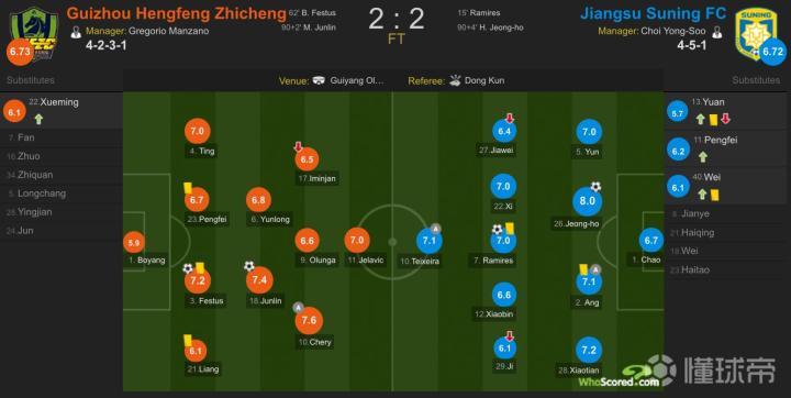 贵州恒丰智诚方面,切里得到全队最高的7.6分,闵俊麟7.4分;江苏苏宁易购方面,补时救主的洪正好获得全场最高的8.0分。