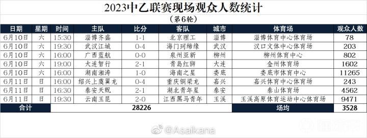 北京时间6月11日。中乙第6轮的比赛全部结束,观众人数方面湘涛主场11265人居首,云南9471人位列次席。本轮平均观众人数为3528人。