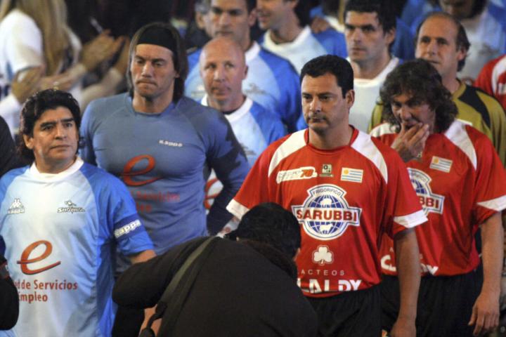 卡洛斯-麦卡利斯特(左三)身着蓝白队服和马拉多纳一起出现在2007年的一场友谊赛上