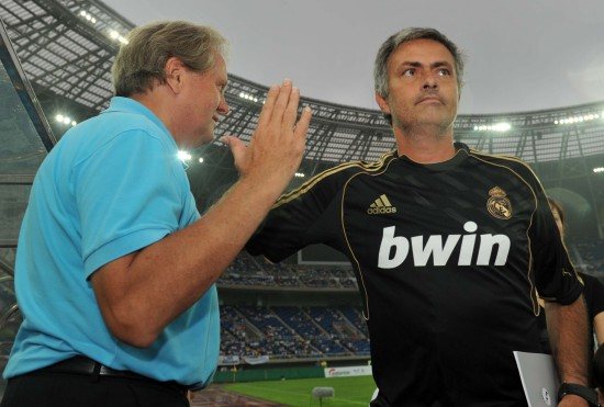 2011年夏季,已是皇马主帅的穆里尼奥,再次率队来华,在广州面对恒大,皇马轻松的以7-1大胜。似乎是受到高层的提醒,这次穆里尼奥脾气收敛了不少,赛前的发布会上还说了褒奖的话:我发现中国球员的技术是不错的,如果他们能更加努力,会取得好的进步。