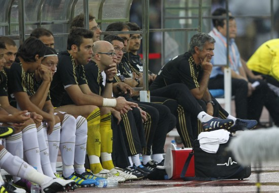 皇马第二站是在天津对阵泰达。公开训练课上,穆里尼奥特意让两位球迷坐到皇马替补席上观看训练,博得掌声。