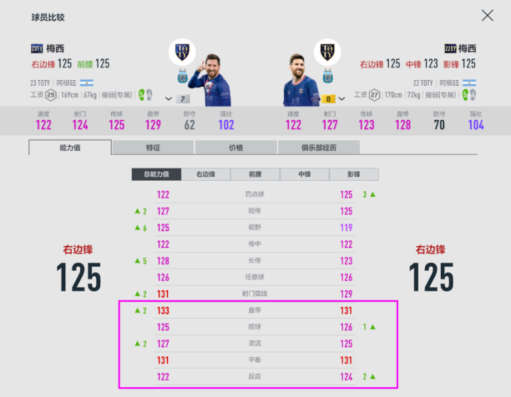 而像22U、WC22、TS赛季金卡则更偏向于前腰或者二前锋的角色,和现实中职业生涯后期的梅西比较相似,更多依靠二过一配合以及原地的花式摆脱过人,从实战体验上来说不如最新的几个赛季卡。