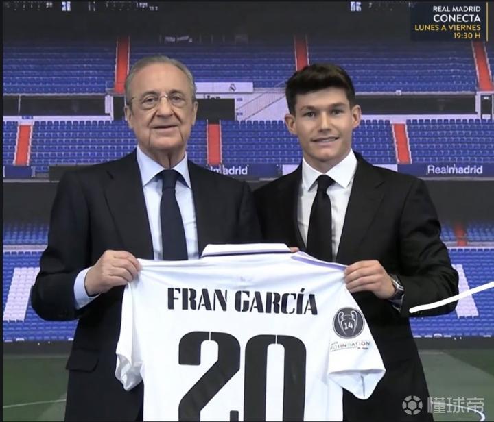 今日,弗兰-加西亚回归皇马,在亮相仪式上,这位左后卫和俱乐部主席弗洛伦蒂诺一起举着20号球衣合影。