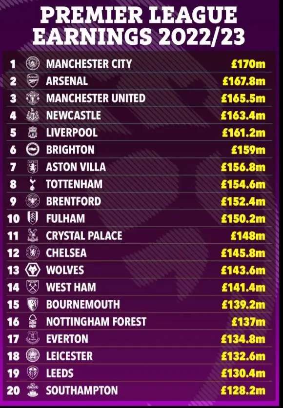 22-23赛季英超球队收入排行榜,看看是否出乎你的意料? 1 .曼城 1.7亿英镑 2 .阿森纳1.678亿英镑 3 .曼联 1.655亿英镑 4 .纽卡斯尔 1.634亿英镑 5 .利物浦 1.612亿英镑 6.布莱顿:1.59亿英镑 7.阿斯顿维拉 1.568亿英镑 8 .托特纳姆热刺 1.546亿英镑 9.布伦特福德 1.524亿英镑 10.富勒姆 1.502亿英镑 11.水晶宫 1.48亿英镑 12.切尔西 1.458亿英镑 13.狼队 1.436亿英镑 14.西汉姆联 1.414亿英镑 15.伯恩茅斯 1.392亿英镑 16.诺丁汉森林 1.37亿英镑 17.埃弗顿 1.348亿英镑 降级队 18.莱斯特城 1.326亿英镑 19.利兹联 1.304亿英镑 20南安普顿1.282亿英镑