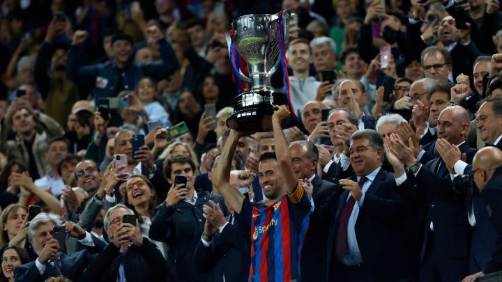 作为巴萨队长的布斯克茨高举冠军奖杯