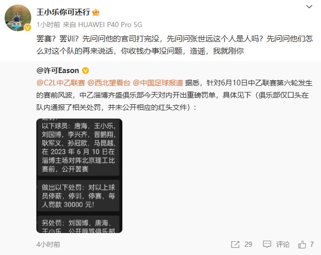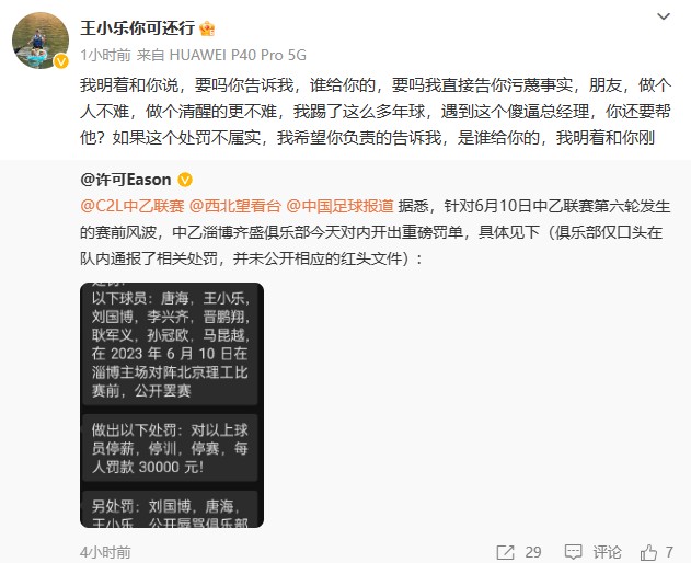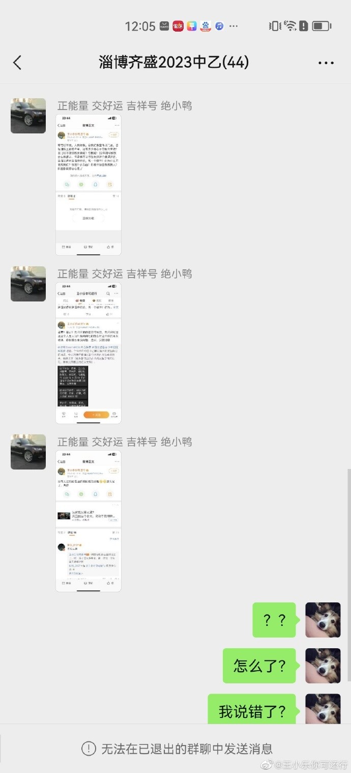 随后王小乐再次发博,称自己被移出“淄博齐盛2023中乙”群。