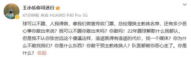 随后王小乐接着回应道:“球可以不踢,人我得做,拿我们做宣传收门票,总经理换主教练名单,还有多少恶心事你敢出来说?我可以不踢你敢出来吗?你敢吗!22年踢球解散什么我都认,但是我不认你张世远这个**这样,造谣就得有造谣的代价,找一个媒体?你为什么不敢找我们?你是什么东西?你敢干预主教练换人?队医都被你恶心走了。你是什么?”