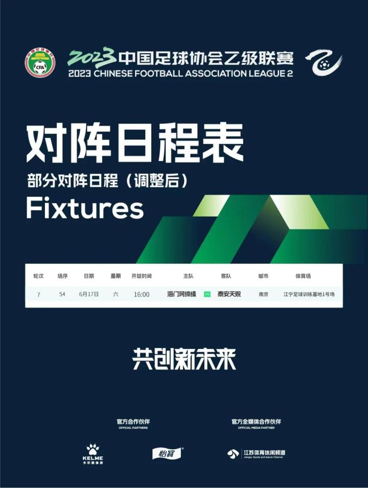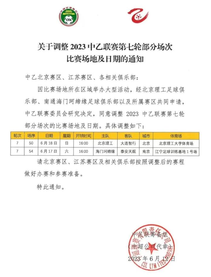 因比赛场地所在区域举办大型活动,经俱乐部及所属赛区共同申请,中乙联赛委员会研究决定,2023中乙联赛第7轮海门珂缔缘VS泰安天贶的比赛时间调整为6月17日(本周六)16:00,比赛地点调整为南京江宁足球训练基地1号场。