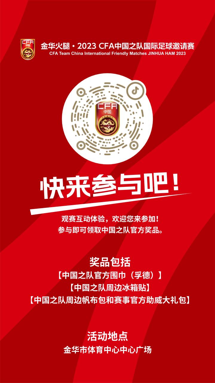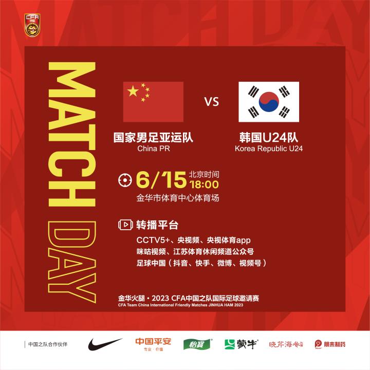 #中国男足亚运队vs韩国U24队 转播计划出炉!...足球中国 @懂球帝2023-06-14 16:43#中国男足亚运队vs韩国U24队 转播计划出炉! 金华火腿 · 2023 CFA中国之队国际足球邀请赛将于6月15日和6月19日在浙江金华举行,中国国家男子足球亚运队将与韩国U24国家男子足球队展开两回合较量。15日18:00,首回合比赛将在金华体育中心体育场举行,@足球中国 抖音、微博、快手、视频号等平台将直播比赛,敬请关注! 15日开赛前15:00-18:00,中国之队官方球迷活动将在金华体育中心中心广场举行,欢迎观赛球迷前来参与互动活动,领取中国之队官方奖品。展开更多