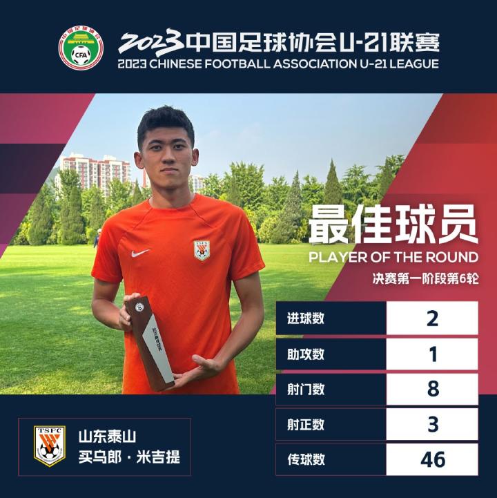 U21联赛官方写道:“在2023中国足球协会U-21联赛决赛第一阶段第6轮比赛中,买乌郎-米吉提在对阵沧州雄狮时上演梅开二度,帮助山东泰山足球俱乐部取得比赛胜利,他也被评为了第6轮最佳球员。”