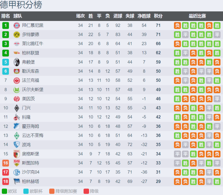 德甲赛季积分榜