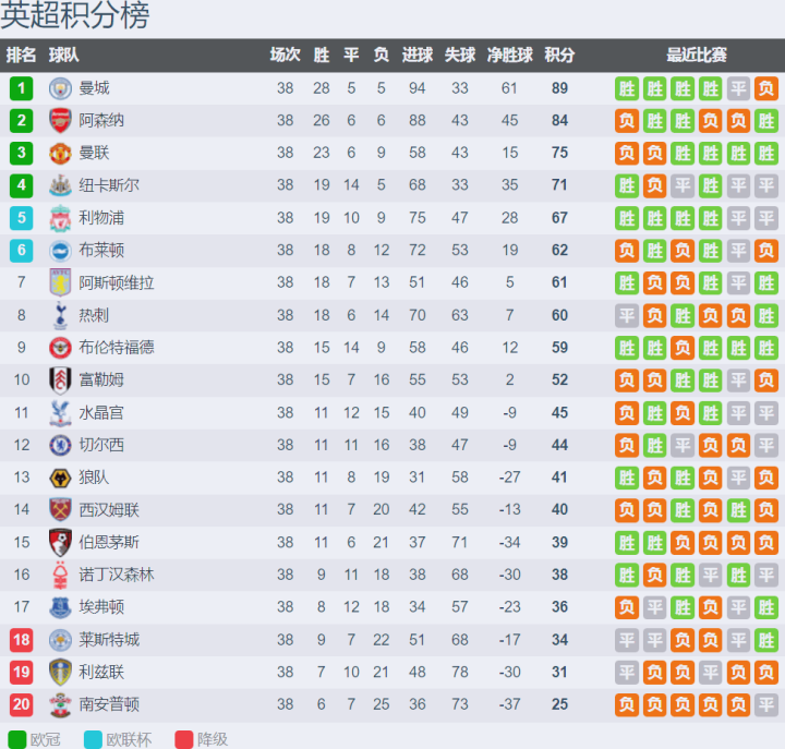 英超赛季积分榜