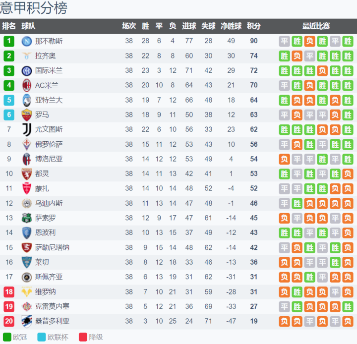 意甲赛季积分榜