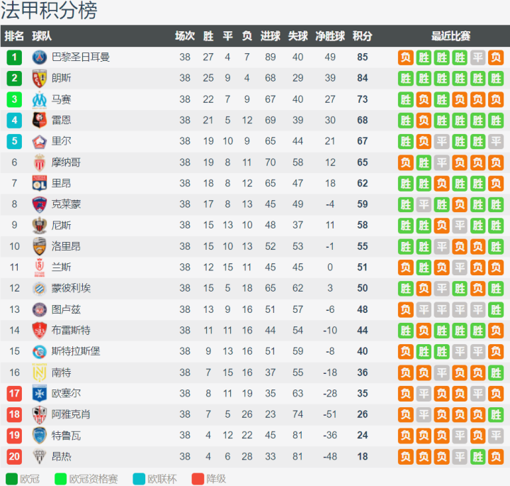 法甲赛季积分榜