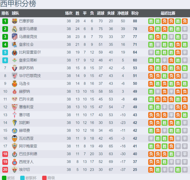 西甲赛季积分榜