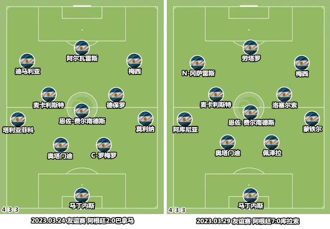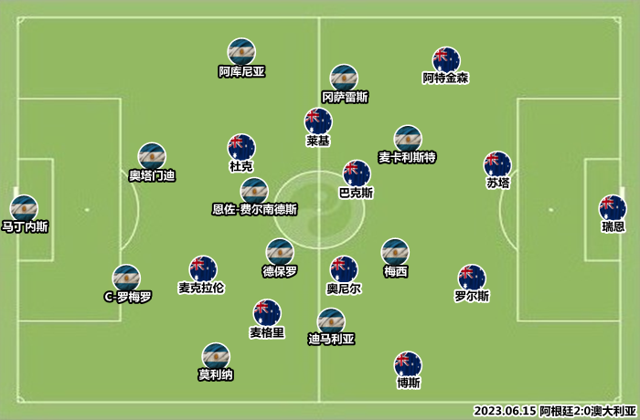 澳大利亚实力不俗,斯卡洛尼给予了对手足够的尊重,排出现阶段的最强阵容。劳塔罗-马丁内斯和阿尔瓦雷斯刚刚参加了欧冠决赛,前者需要治疗脚踝伤势,后者的身体状态没有恢复到100%。两名在卡塔尔之旅中担任过突前箭头的球员缺阵,斯卡洛尼没有使用“第三中锋”乔瓦尼-西蒙尼,而是安排在欧协联决赛中表现出色的尼古拉斯-冈萨雷斯首发,梅西担任“伪九”,搭建一个433切换442阵型。