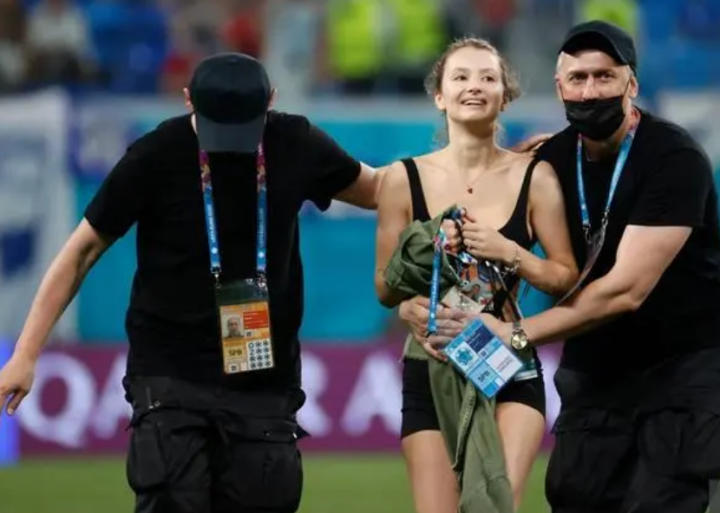 (图)欧洲杯上,一名为了出名的女球迷闯入场地后,达成愿望