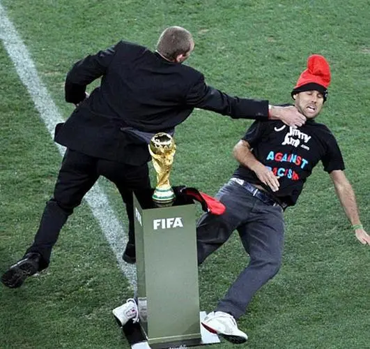 2010年的南非世界杯决赛时,吉米蹦又玩了新花样,他冲入球场后,想将帽子戴在上大力神杯上,结果被及时出现的安保一拳击倒。