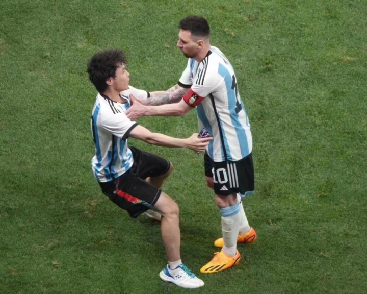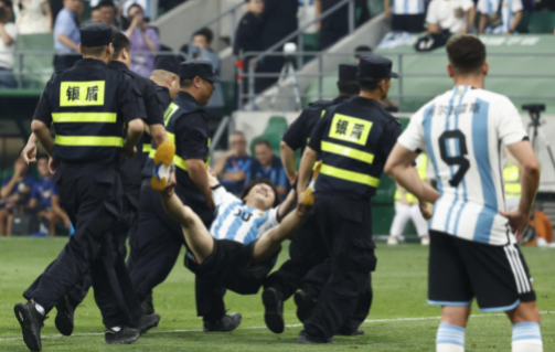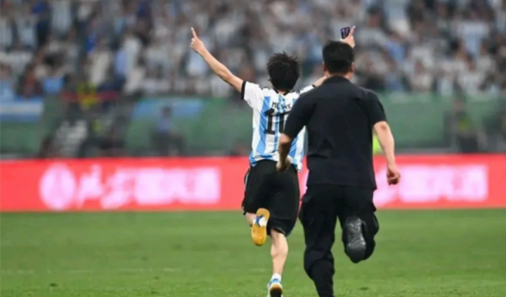 再回到球迷冲入工体事件的本身,当这位孩子奔向梅西的那一刻,阿根廷人双手向前是有一点抗拒的。最后他在球场上奔驰,梅西的挤出的笑容更多的是尴尬和无奈,可能还有点后怕。