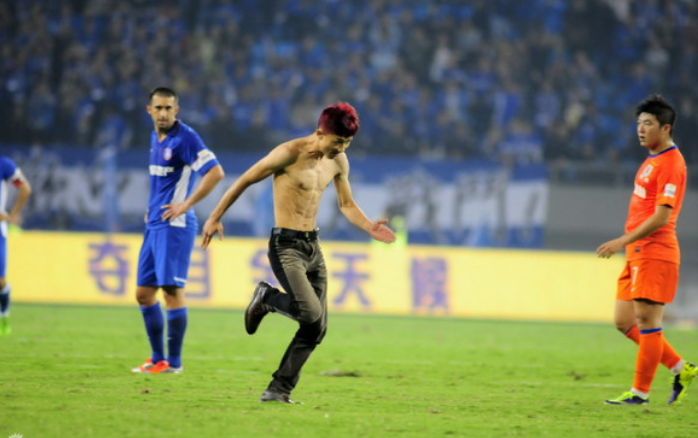 在中超赛场不是没有这样的先例,2013赛季中超,江苏舜天对战山东鲁能,一位20岁的红发江苏球迷赤膊冲入场内,他尽情的奔跑者,结果是被拘留7天,一年之内不得进场看球。