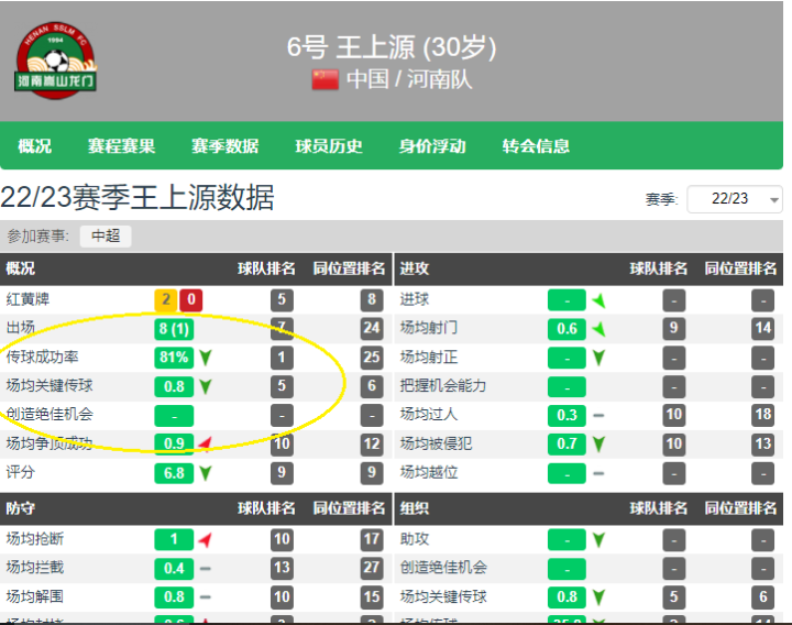 虽然赛季平均81%的传球成功率仍位居河南队内第一,但王上源本赛季关键传球场均0.8次,甚至不到上赛季场均1.9次关键传球的二分之一!在河南队中,王大将军虽然堪称兢兢业业,但进攻创造力几乎完全被遏止!其他方面,王上源场均传球数从上赛季的54.3次下降到35.8次,传球成功率从85%下降至81%,场均被侵犯从1.3次下降为0.7次。