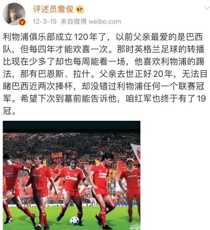 这种以足球为父子纽带的关系在中国其实也有很多,其中著名足球评论员詹俊老师就是最典型的代表。在利物浦队成立120周年之时,詹俊老师发了微博缅怀自己父亲:“他喜欢利物浦的踢法,那有巴恩斯、拉什。父亲去世正好20年……没错过利物浦任何一个联赛冠军。希望下次到墓前能告诉他,咱红军也终于有了19冠。”