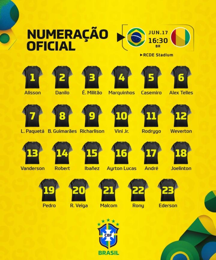 巴西国家队公布了队员们的号码,卡塞米罗身穿5号、帕奎塔身穿7号,维尼修斯穿上了象征核心的10号球衣。