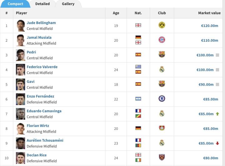 【德转中场球员身价前十:贝林厄姆、穆西亚拉、佩德里位列前三】