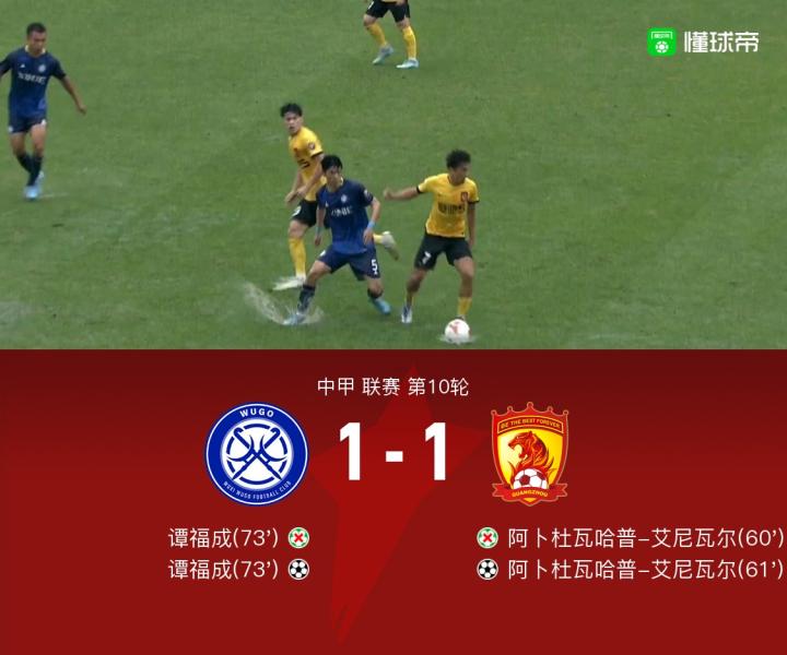 【广州1-1无锡,阿卜杜瓦哈普破门+失点,谭福成点球补射扳平】