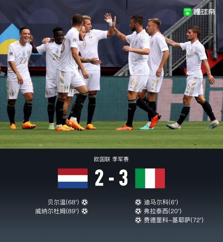 【意大利3-2荷兰获欧国联季军,基耶萨替补建功,迪马尔科破门】