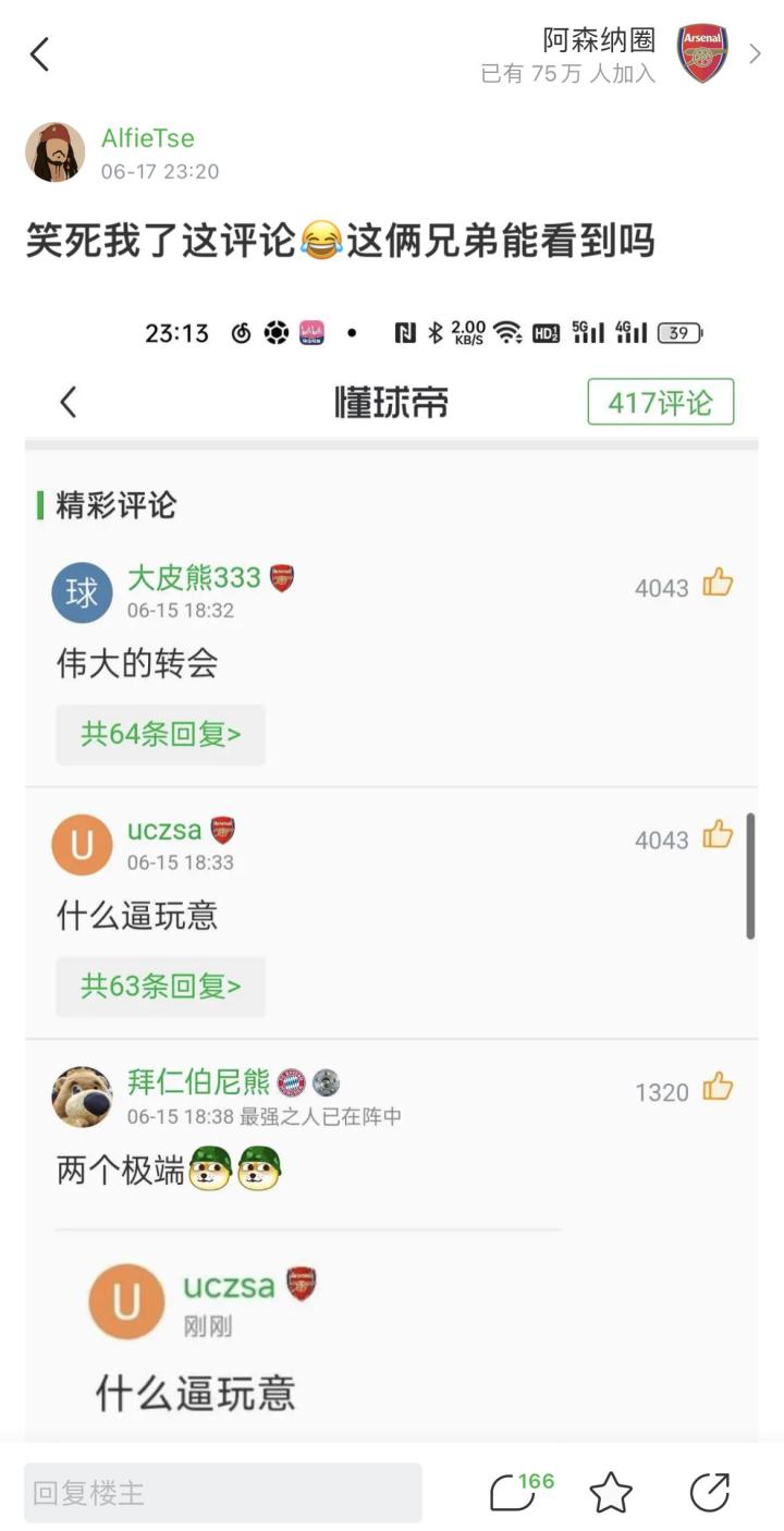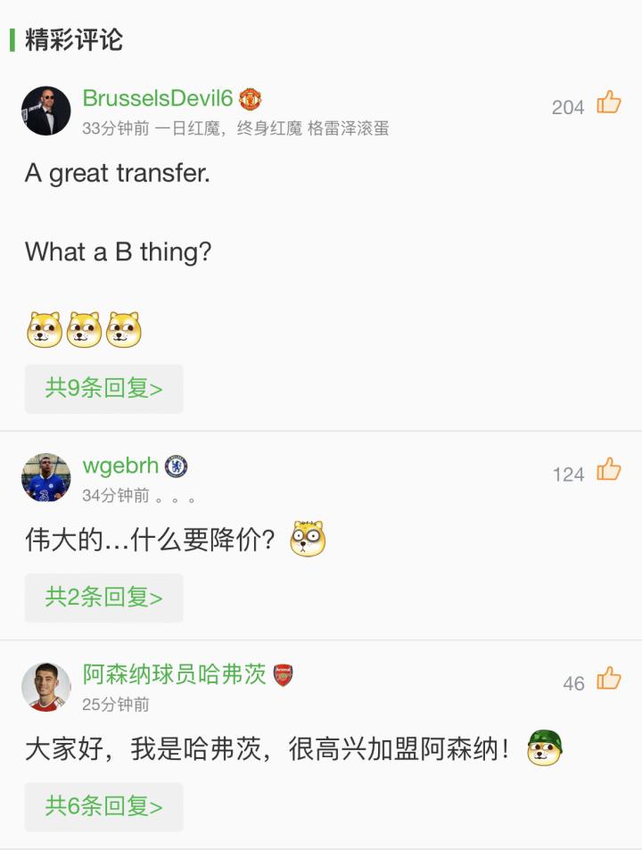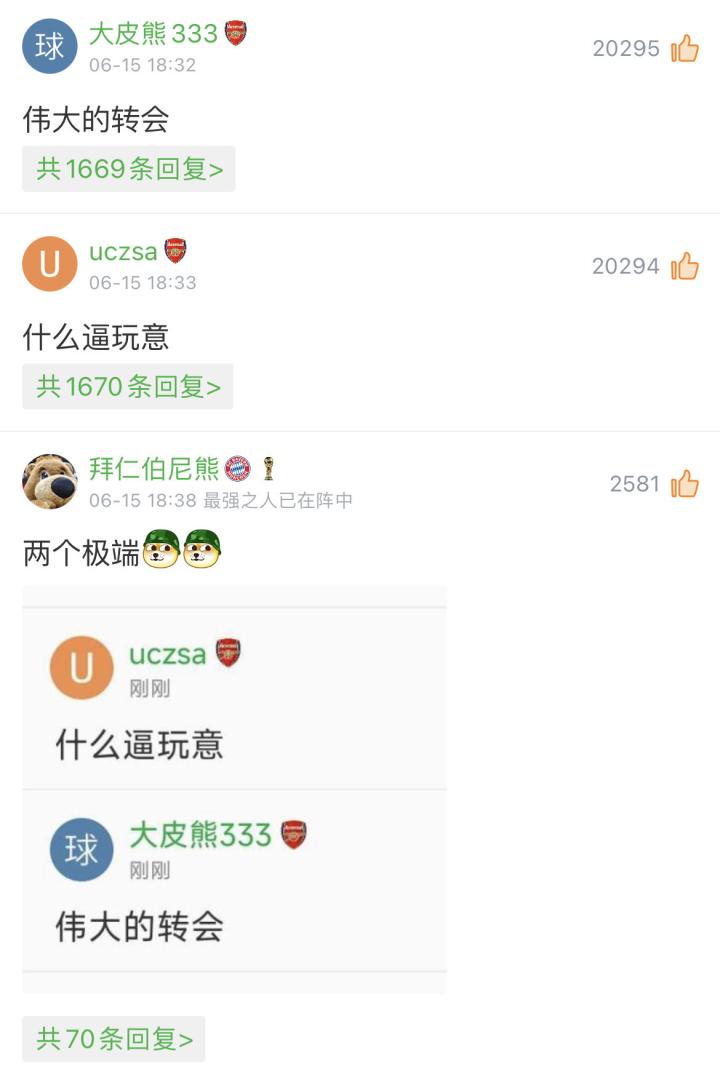 活动君懂球帝热门梗之【伟大的转会 & 什么x玩意】[绿帽狗头] 最近我懂新闻评论区总能看见“伟大的转会、什么x玩意”,该评论出自文章:德天空:阿森纳引进哈弗茨谈判进展顺利,拜仁无意加入争夺。 两位阿森纳球迷矛盾向左,登上了最初的热评区,而该内容被热心网友发现后发到了阿森纳圈,引起了我懂老哥们的关注! 不止是关于哈弗茨此次转会能否成功的占队,数万名老哥为了保持点赞&评论数持平自发宣传,只为让两个极端都不再那么极端[绿帽狗头],甚至不少老哥们也开始在其他各大转会新闻下玩起了此梗,还出现了英文版!两位老哥何时分出胜负?你想把点赞送给谁?点击前往原文章