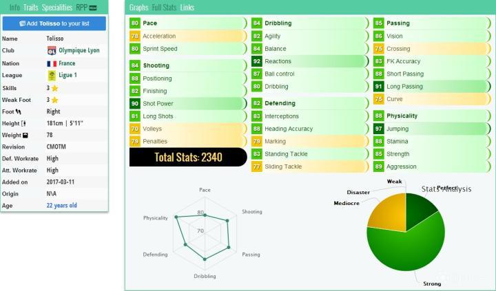 由于上半赛季的出色表现,EA将托里索的金卡数据总评从78提升到了80,他的优秀表现是大家有目共睹的。