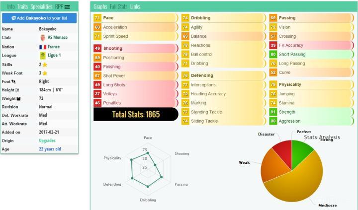 巴卡约科在FIFA17中初始数据只有74,还是一张银卡,但是在前半赛季的超强表现后,他的总评一跃到78,直接从银卡变成金卡。
