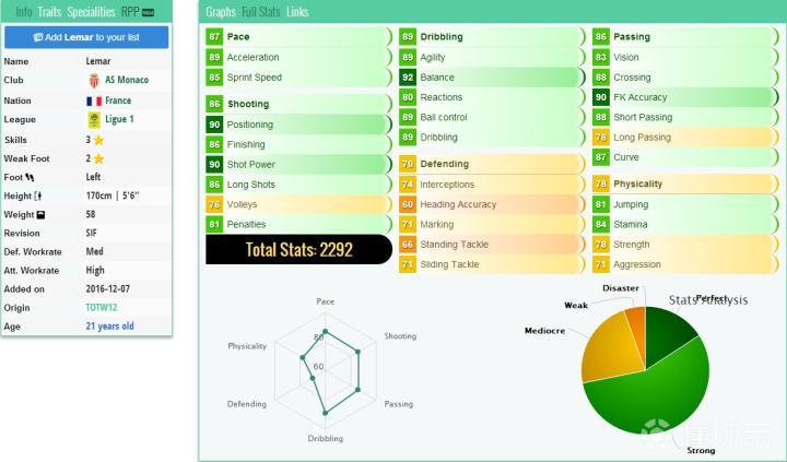 不过“二黑”勒马尔的数据就非常“爆炸”了,不论是速度、盘带、射术、传球都非常不错,还有一脚任意球。虽然他的花式只有3星、逆足只有2星,不过不到10万金币的价格也算是物美价廉了。