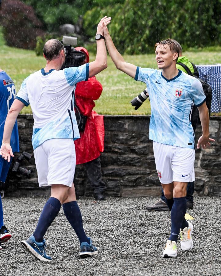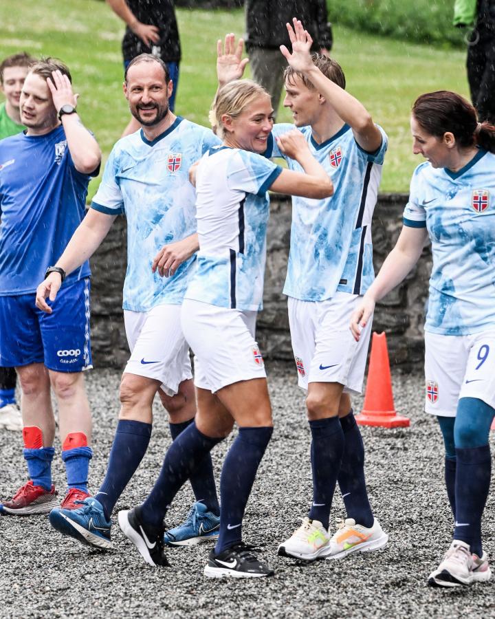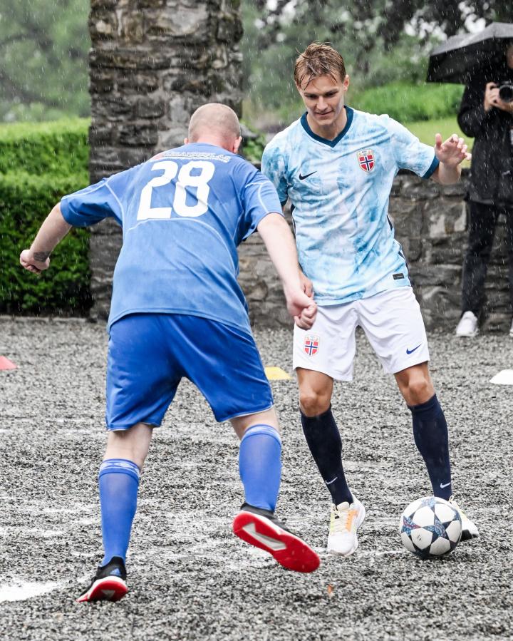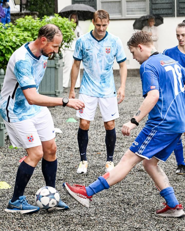 挪威男足队长厄德高和挪威女足队长姆耶尔德以及前挪威国脚弗约托夫特加入王储家族的斯考古姆队,对阵Bøn Unified队,这是一支旨在为残疾人提供体育活动的运动队。