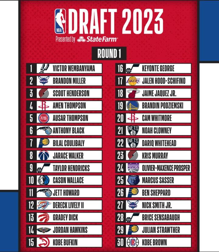 北京时间6月23日,2023NBA选秀大会举行,马刺用状元签选中本届最大热门、身高2.24米的法国新星文班亚马,黄蜂用榜眼签选中前锋布兰登-米勒,开拓者用探花签选择后卫斯科特-亨德森,火箭用四号签选择后卫阿门-汤普森。