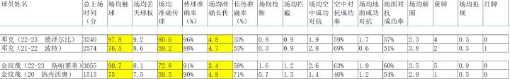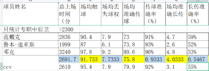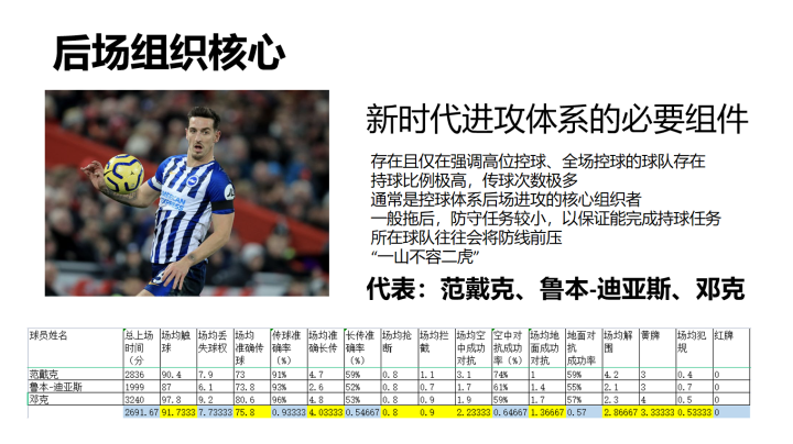 第一类中后卫是后场组织核心:顾名思义,他们是整个后场、甚至是整个球队的真正核心。他们或许不专职于防守,没有华丽的铲抢数据,但他们在高举高打的球队体系中有重大的意义。他们往往会领导整条防线拉上、在后场全权组织控球、控制球队进攻的时机,用一脚传球打响进攻的号角。本赛季的英超联赛中,能够称为后场组织核心的有且仅有三人:范戴克、鲁本迪亚斯、邓克。因为这类中卫实在过于重要,我将出场时间不合格的鲁本迪亚斯也加入了表格中,以便直观的体现这类球员的共同特征。