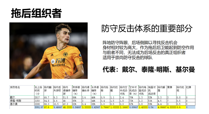 拖后组织者是一类经常会受到诟病的球员。他们是传统防守反击的重要组件,因为它们能完成防守反击中中卫的重要任务——防空与阵地防守。在非防反体系下,他们中的很大一部分难以体现自己的作用:身材高大导致行动较慢、脚下粗糙导致难以完成地面防守任务。在防反体系下,无论他们能力如何,布置一个拖后组织者是必要的。在本赛季能够称为拖后组织者的有三人,分别是戴尔、明斯和基尔曼,其中“戴大队长”和明斯常常受到诟病,这正体现了这个位置的矛盾性。