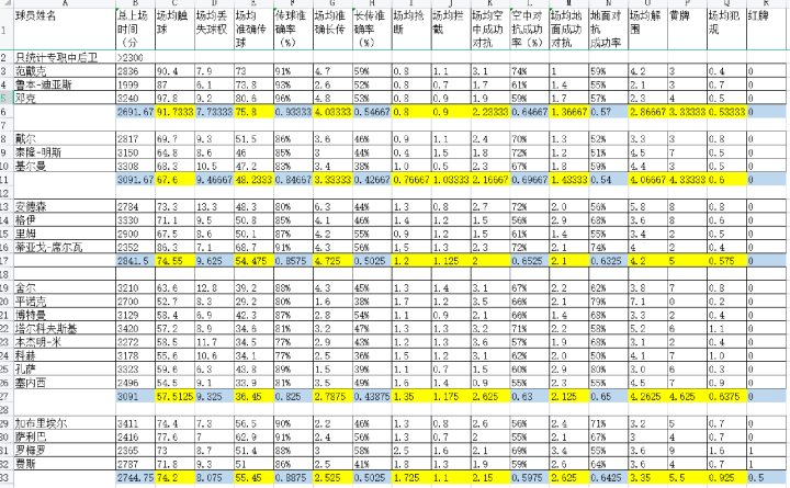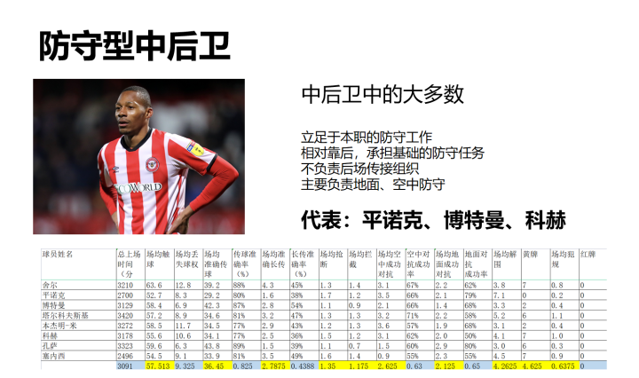 这是一张统计了上赛季英超上场时间>2300分钟的专职中后卫的表格,我将这些中后卫分成了特征鲜明的五类,并会在接下来的视频详细探讨这套分类方法的分类依据和实际意义。